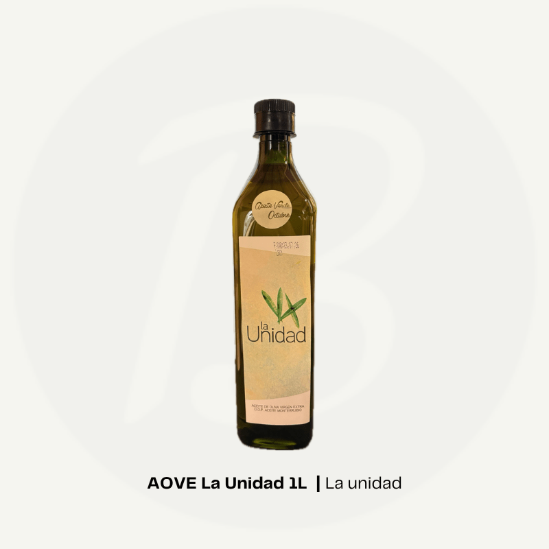 Aceite de Oliva Virgen Extra La Unidad 1 L, de la sociedad cooperativa La Unidad (DOP Monterrubio). Sabor frutado y equilibrado con notas suaves de amargor y picor, ideal para uso diario, cocinar y aliñar, manteniendo alta calidad.