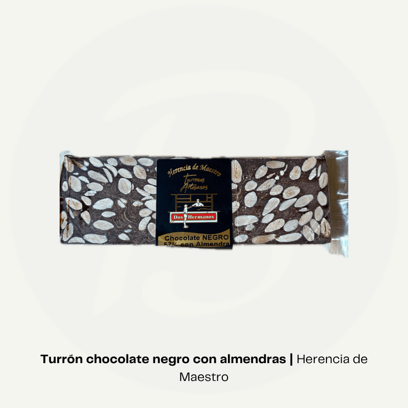 Turrón de chocolate negro con almendras de la marca Dos Hermanos. Combinación intensa de cacao y frutos secos, elaborada con receta artesana en Castuera, con equilibrio entre dulzor y carácter.
